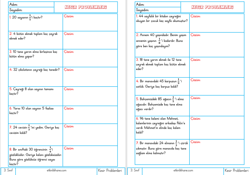 Paylaş Facebook'ta Paylaş Twitter'da Paylaş Pinterest Email 3. Sınıf Kesir Problemleri3. Sınıf Kesir Problemleri3. Sınıf Kesir Problemleriİndir3. Sınıf Kesir Problemleri (Google Drive İndirme Linki) Görüntüleme: 9353. sınıf kesirlerkesir etkinliklerikesir problelerikesirler etkinlikhane Etkinlikler, materyaller, çalışma kağıtları, ders planları, görüntüler ve videolar üreticisi, Önceki Gönderi 1. Sınıf Toplama İşlemi Problemleri – 3 21 Şubat 2026 Sonraki Gönderi Yeşilay Haftası Boyama Sayfaları 4 Mart 2026 İlgili Mesajlar 4. Sınıf Kesirler Etkinlikleri 20 Nisan 2023 4. Sınıf Kesirler Testleri 20 Nisan 2023 4. Sınıf Kesir Problemleri 20 Nisan 2023 4. Sınıf Kesirlerde Toplama ve Çıkarma Etkinlikleri 1 Mart 2023 4. Sınıf Kesirler Konu Anlatımı ve Etkinlikleri 1 Mart 2023 3. Sınıf Bütün, Yarım ve Çeyrek Modellerini Kesir Olarak Gösterme Etkinlikleri 28 Ekim 2020Bir Yorum Yaz Cancel Reply Bir dahaki sefere yorum yaptığımda kullanılmak üzere adımı, e-posta adresimi ve web site adresimi bu tarayıcıya kaydet. Δ